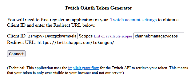 channel:manage:videosin theScopesfield. Example: - Press the Connect button, you will now see something like this: