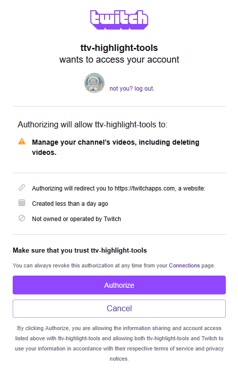 You will only see the video management warning if you followed step 3. This is not mandatory if you don't want to delete highlights using this tool. - Now press the "Authorize" button