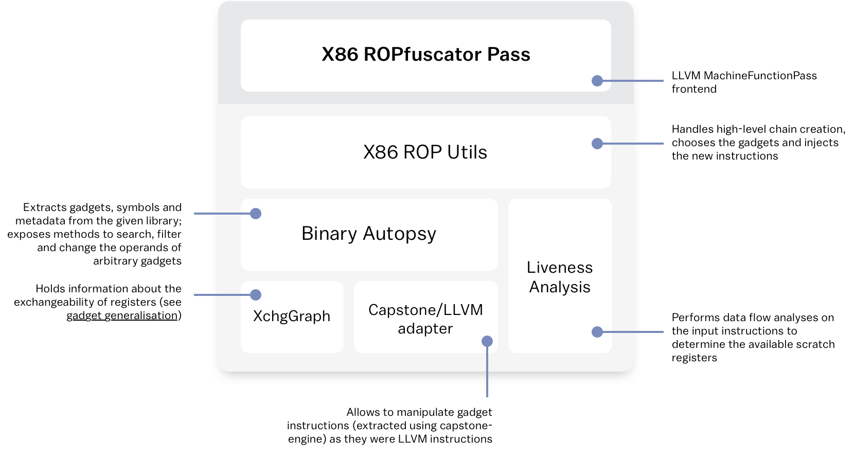 ROPfuscator is an LLVM backend extension that aims to perform code obfuscation taking advantage of ROP chains: supported instructions are replaced by semantically equivalent ROP gadgets.