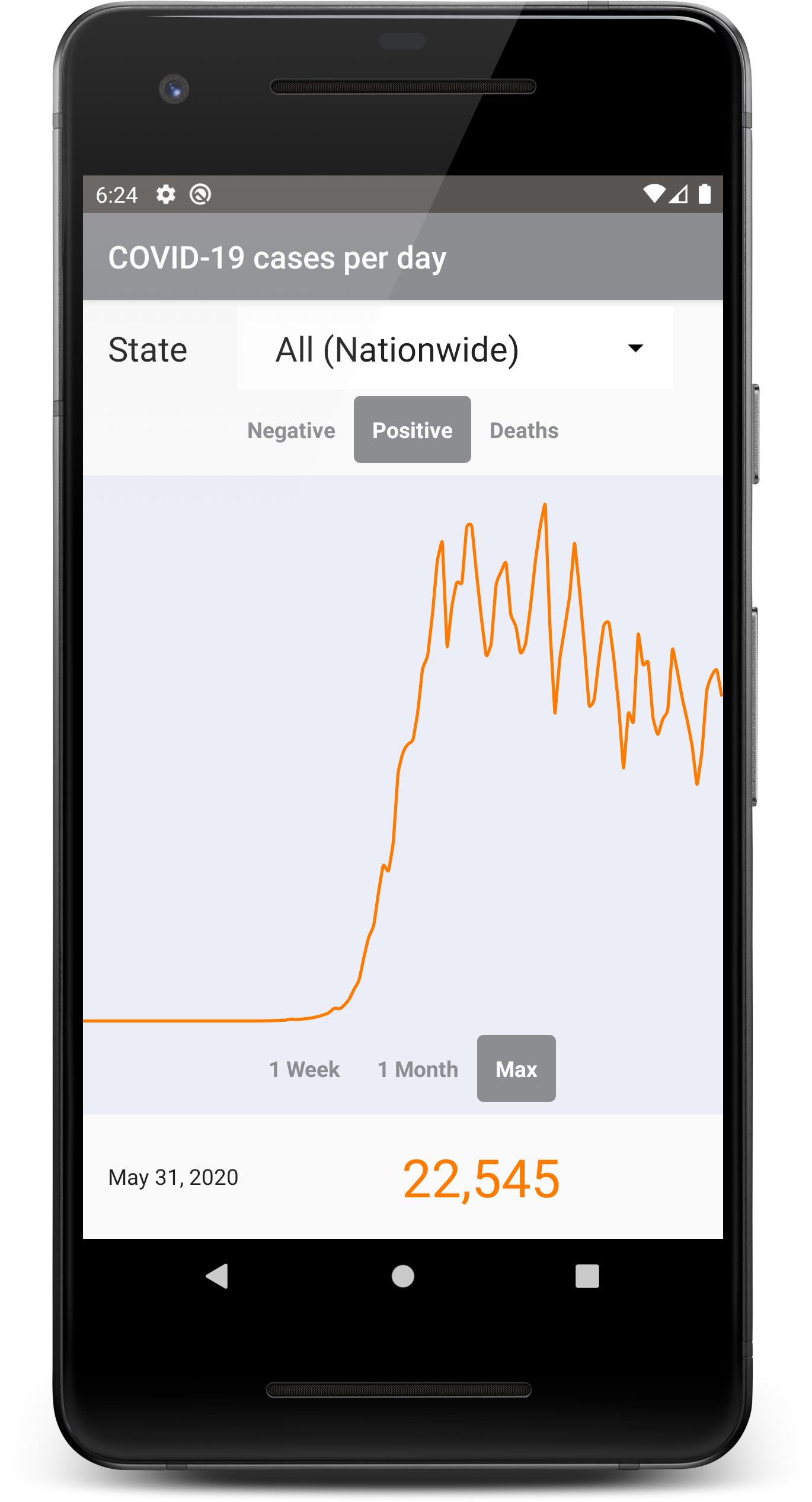 An open-source Android COVID-19 tracking app built using core UI components from the Robinhood stock trading app. The app displays key metrics around the growth of coronavirus, including the number of positive cases, negative cases, and deaths per day.