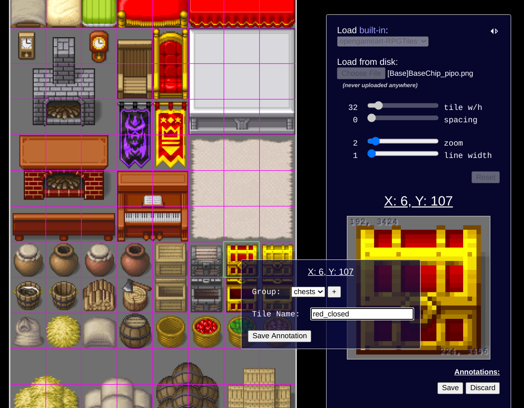 Right-click any tile to annotate it with a group & name. Once annotation mode has been entered - implicitly by creating the first annotation group - tilemap loading & parameter controls will be locked (though viewport controls will remain available).