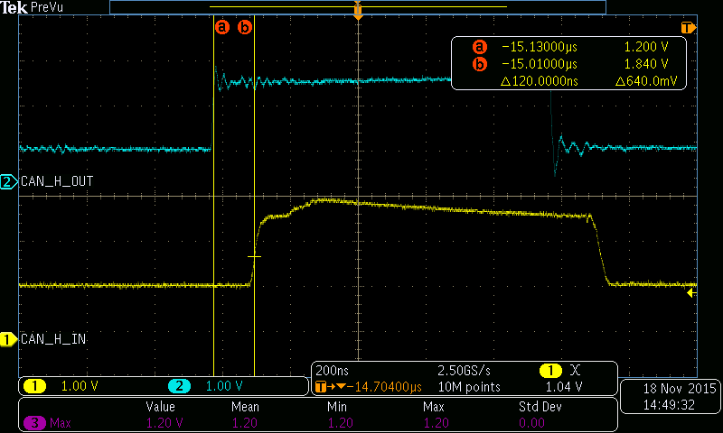 In each case, the latency is right about 120ns. This is on the order of the propagation delay seen on a 40 meter bus (1/C * 40m = 133nS). Referencing the timing table in the AMIS42770 datasheet, this is around what we would expect. Worst-case latency might be higher, but is likely still well within the propagation segment of a 1Mbps CAN bus (I believe 500ns is typical for this).
