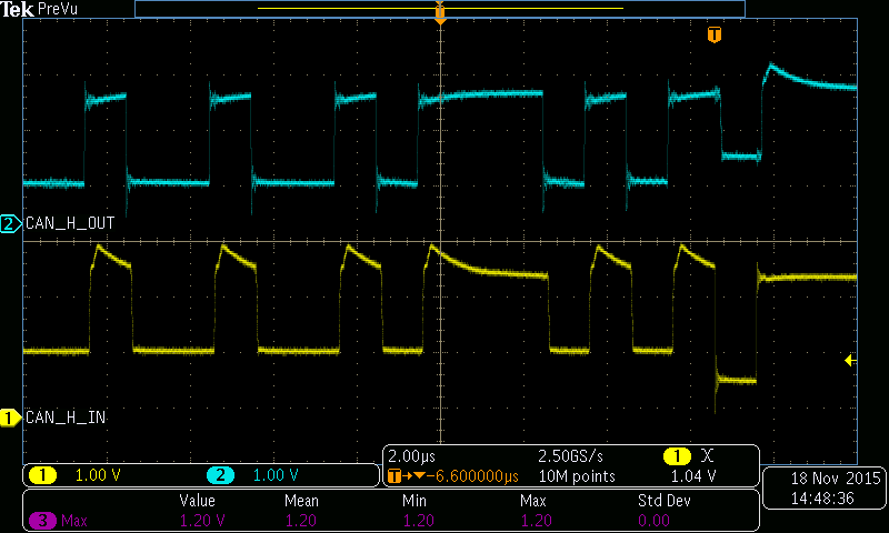 Here is an example capture of data on the CAN-H line of two buses, with CAN-H-IN being the side connected to the CAN master, and CAN-H-OUT the side connected to the CAN slave. In this capture, I believe the slave was transmitting, as you can actually see that CAN-H-IN lags CAN-H-OUT ever so slightly: