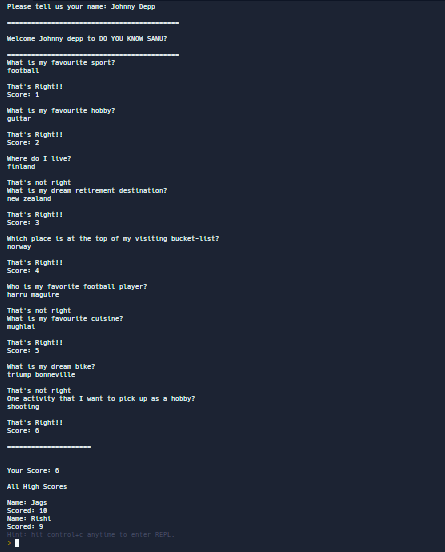 Sanunavo-Quiz How well do you know Sanu quiz/ CLI App This is basically a quiz about me, aka Sanu to test how well do you know me. This quiz can be run as a CLI App via the below link- https://replit.com/@SanunavoDey1/CLIApp#index.js?embed=1&output=1 Project snapshot-