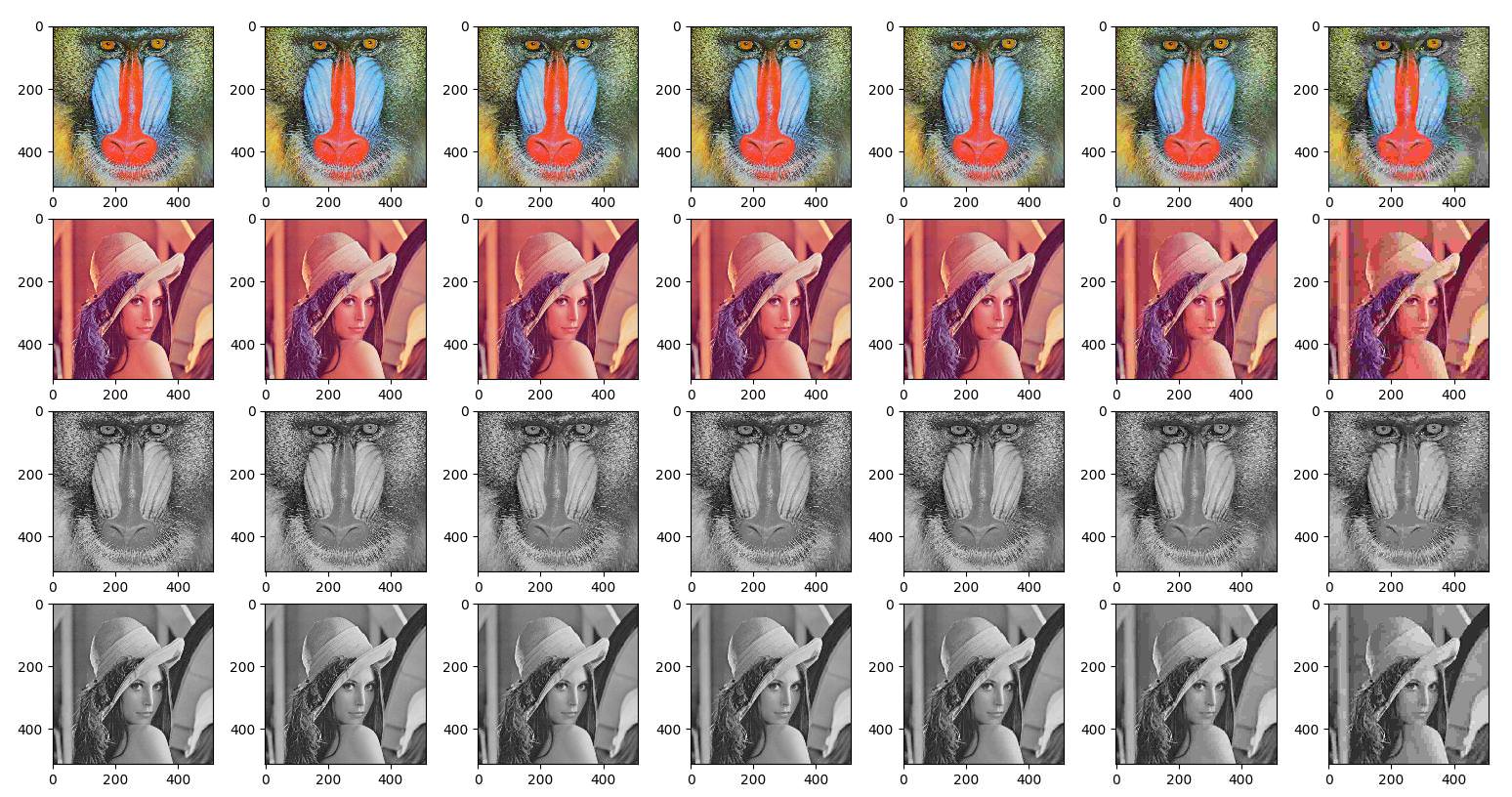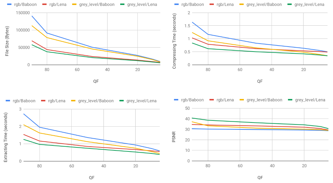 pytestThe PSNR gets higher, compressing/extracting time elapsing gets longer and file size gets smaller with higher QF.