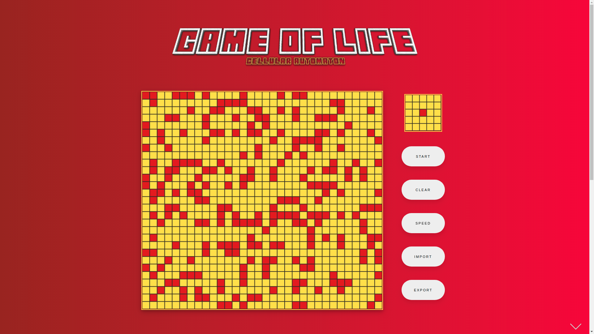 Game Of Life 🐪 A Conway's Game of Life. 🐎 Installation # install dependencies yarn # 1. standalone app (version 1 w/ electron) yarn run start # 2. web version (version 2 w/ express) yarn run dev ✏️ If you ran the web version, visit localhost:3000. 🌌 Screenshots Basic gameplay Epic brushes 🐊 Resources Conway's Game of Life P5JS