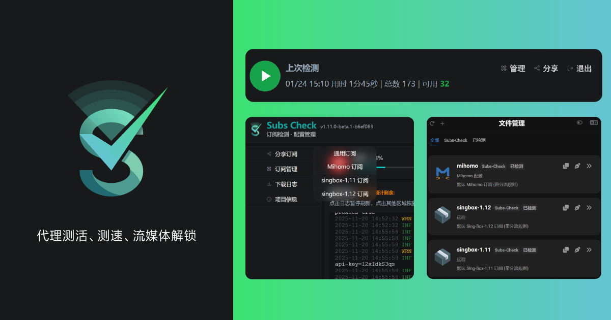 测活、测速、媒体解锁,代理检测工具,支持 100-1000 高并发低占用运行,检测结果更准确。全新设计,适配 PC 和手机设备的现代 WebUI 配置管理界面,自动生成 mihomo 和 singbox 订阅,集成 sub-store 前端和后端,支持一键复制分享;支持自动无缝版本更新。