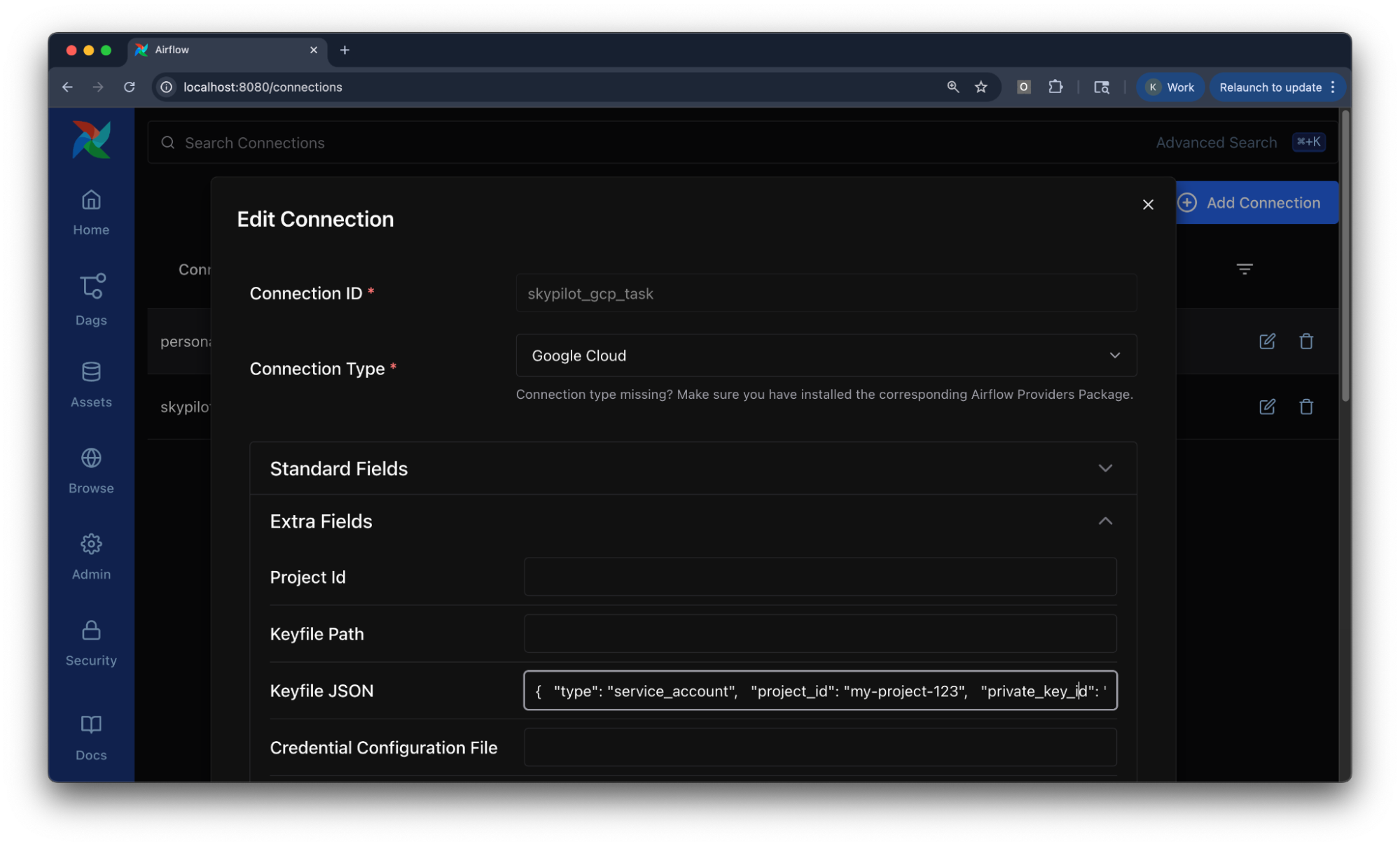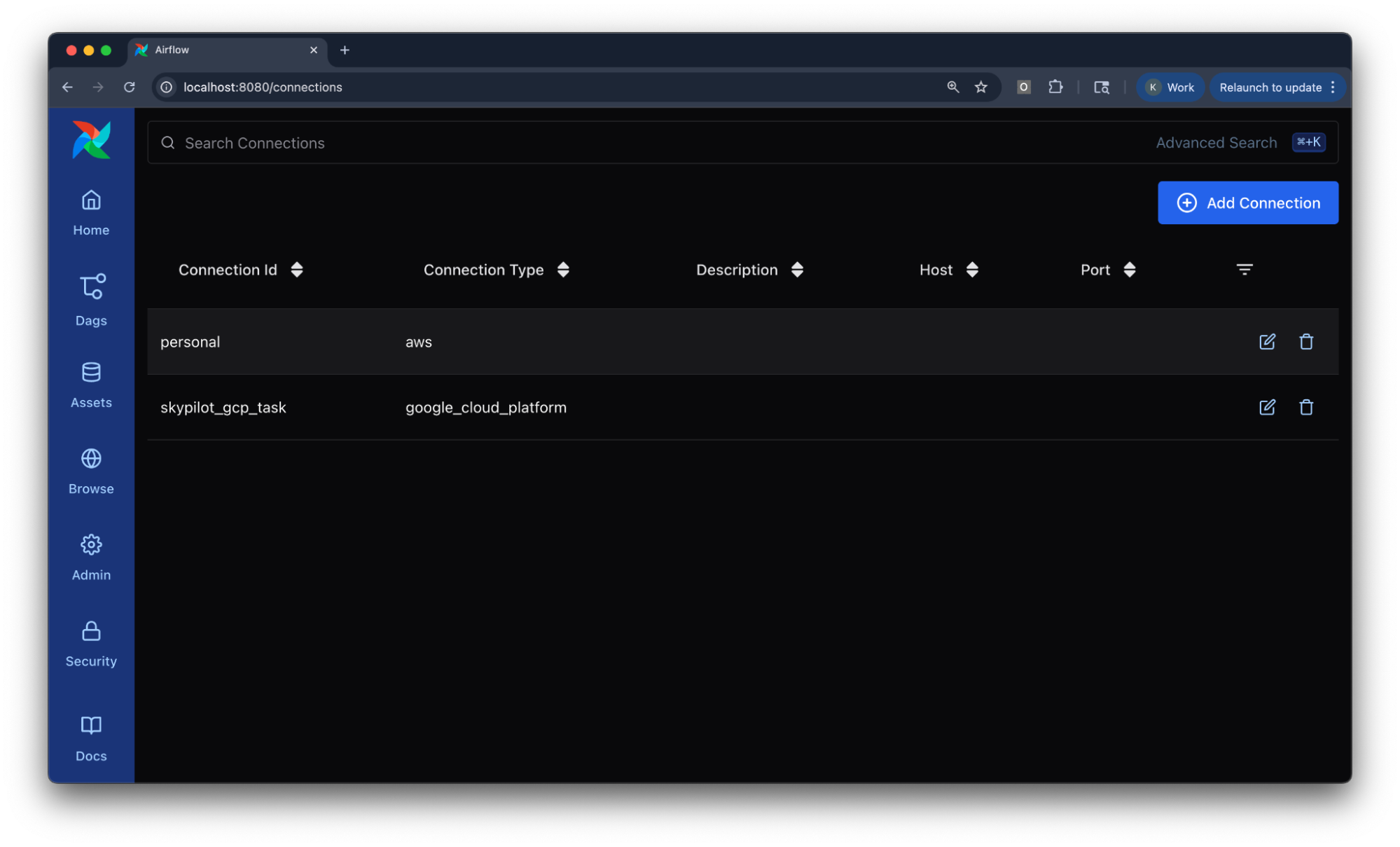 Create connections in Airflow to store your cloud credentials. Today, we support AWS and GCP connections