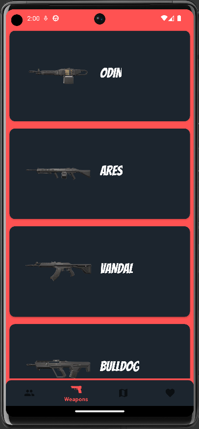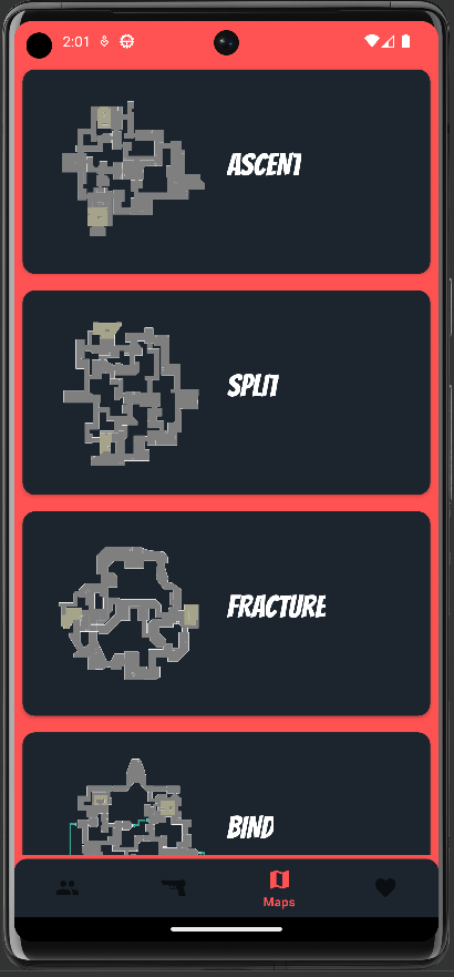 | SPLASH SCREEN | AGENTS SCREEN | WEAPONS SCREEN | MAPS SCREEN | FAVORİTE SCREEN |