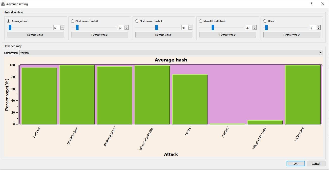 - Able to compare pictures that was resized, blurring, different contrast, blurring, noise(gaussian), embedded with watermark, different format, jpeg compression