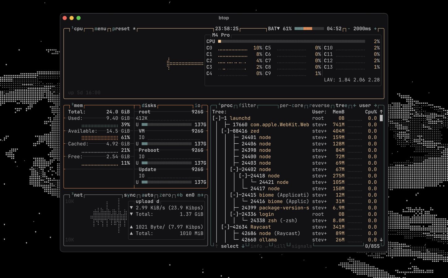 Nothing is more satisfying than viewing your system processes, and there's not a better way to do that than with btop. For best color results, update the theme to TTY by hitting ESC then going to Settings.