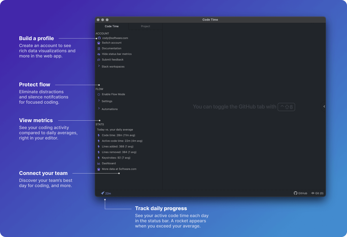 Your status bar shows you in real-time how many hours and minutes you code each day. A rocket will appear if your active code time exceeds your daily average on this day of the week.