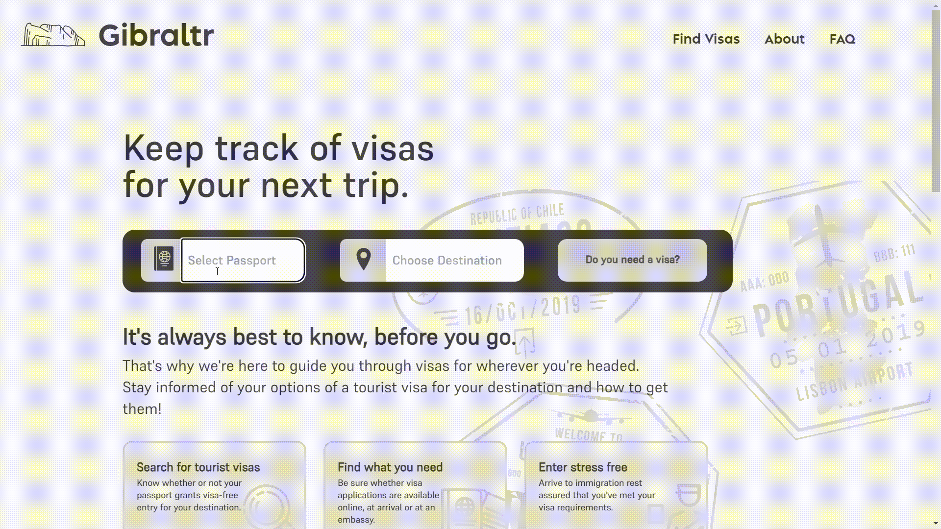 Gibraltr is a website that allows you to check visa requirements for every nationality no matter the destination. Access the latest accurate and reliable information for your next trip. It's always best to know before you go, and that's why Gibraltr is here to provide awareness to all international travelers.