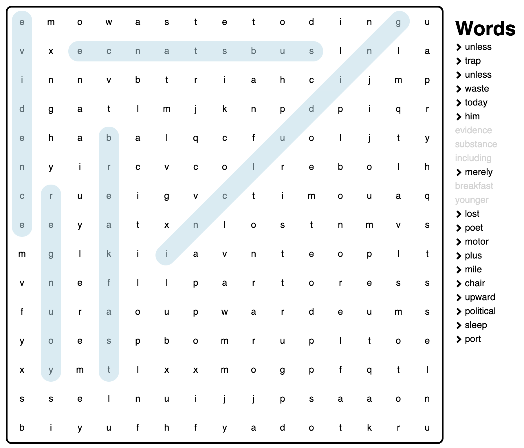 A very basic word search game. With a list of randomly generated words, a grid is created. The user is then tasked with trying to find these words. As words are found, they stay selected on the grid and crossed out from the word list.
