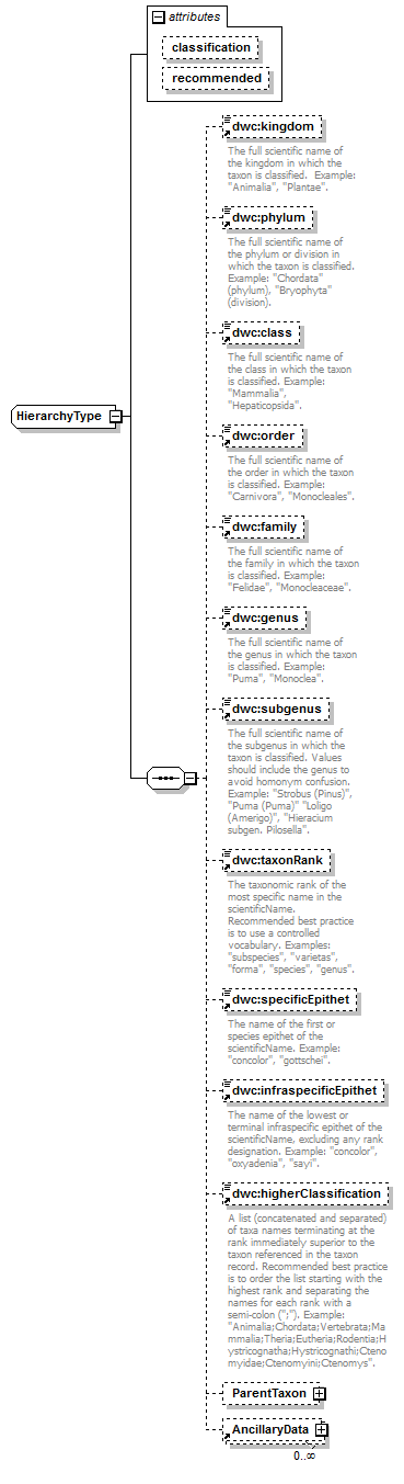 | TaxonRank | xs:string | The taxonomic rank of the most specific name in the scientificName. Recommended best practice is to use a controlled vocabulary. | http://rs.tdwg.org/dwc/2009-09-23/terms/index.htm#taxonRank |