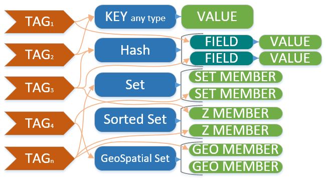 Get all the keys, hash fields and set members related to the given tags: