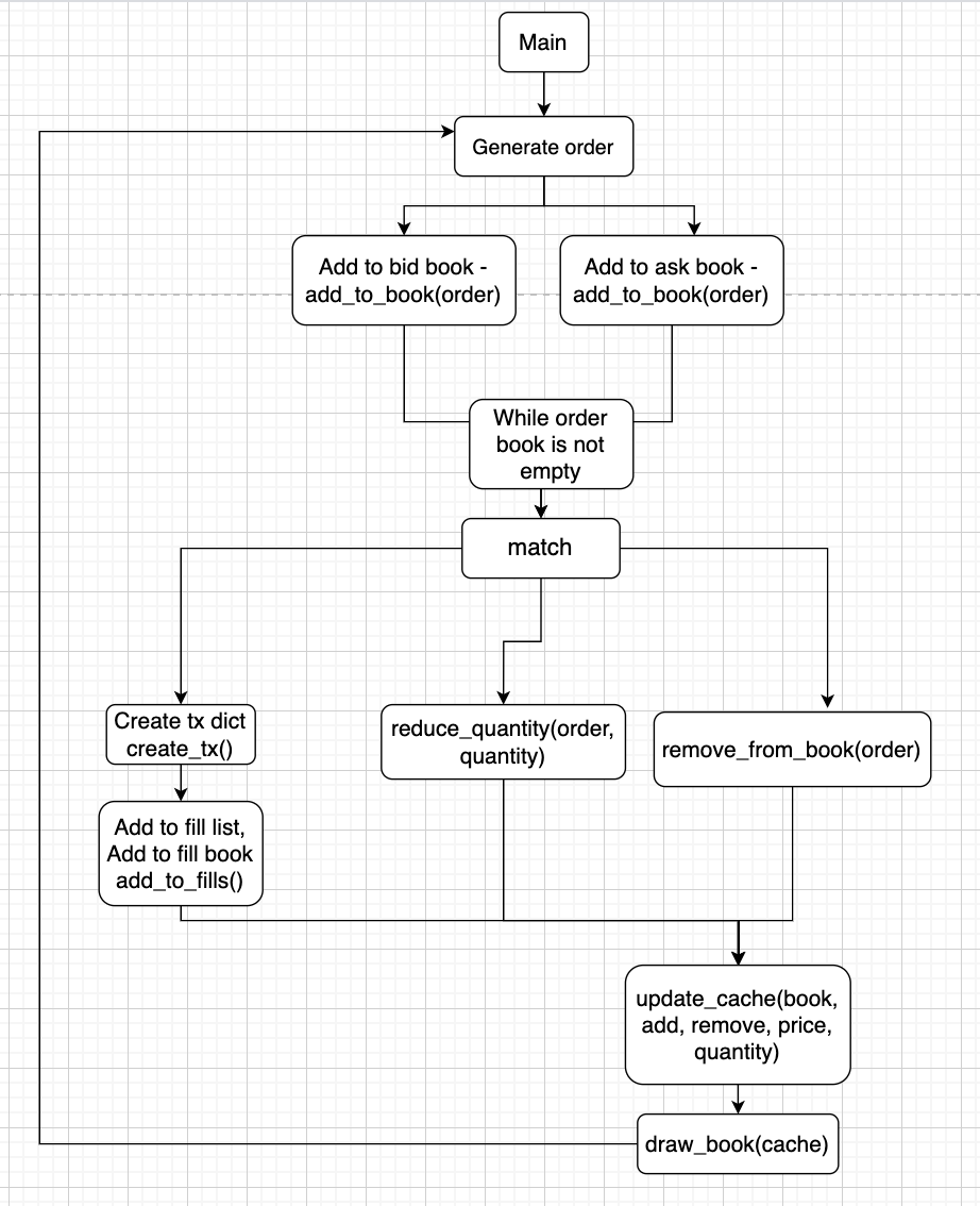 The control flow of the program is detailed by the flowchart shown below. At runtime, main() initialises many of the data structures used by the rest of the application. An order is generated and passed to one side of the order book. If the order book is not empty, match() is called. It selects the best quote on either side of the book and consummates a trade if each order satisfies a certain price.