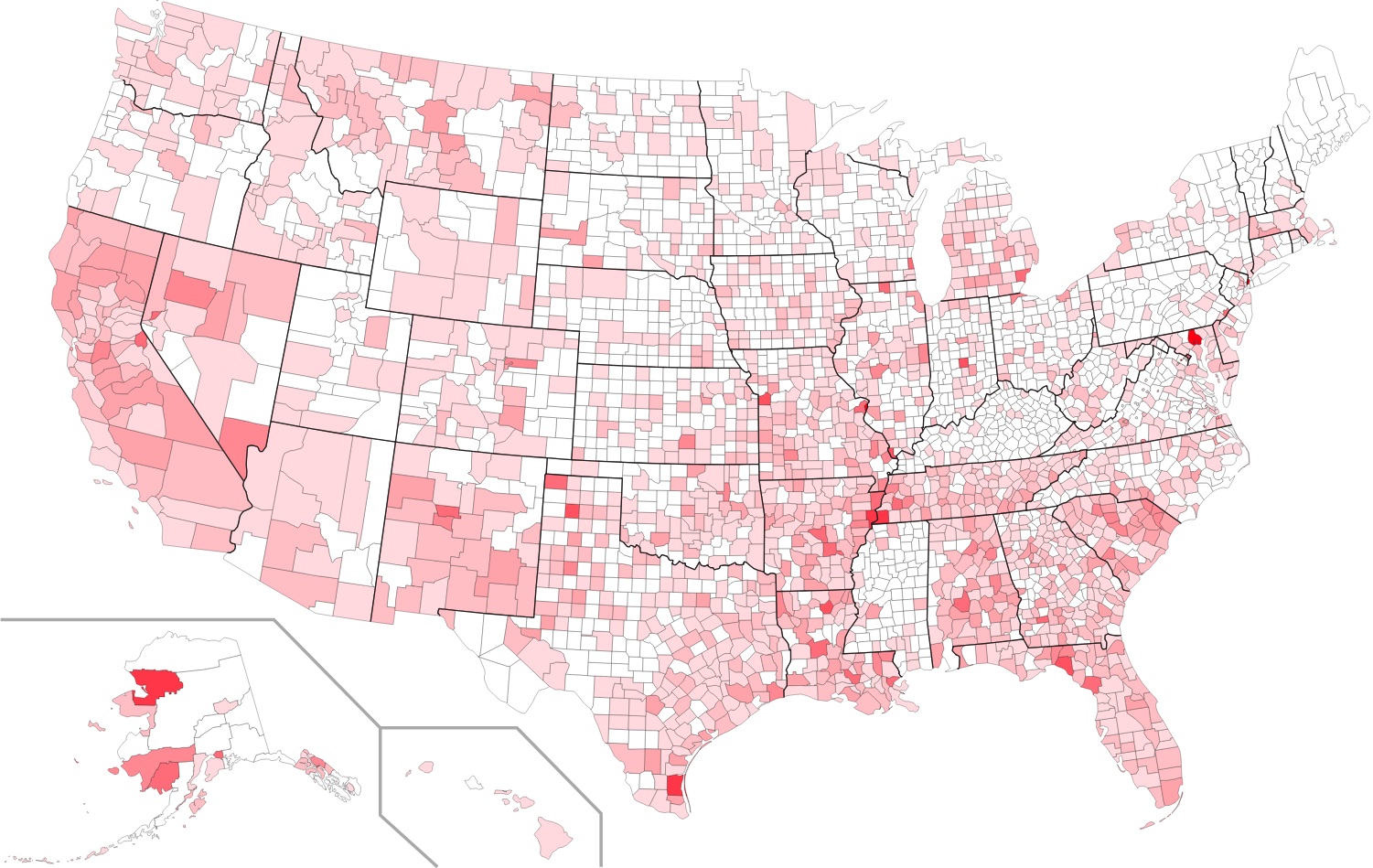 All values are calculated for crimes per 1000 people. Brighter shades of red mean more crime for that county and lighter shades of red mean less crime. There were 10 color steps used in this project and for the violent crime map the steps go from 0 to 18+ crimes per 1000 people and the color steps every 2 additional crimes. The property crime map has a range of 0 to 90+ crimes and the color steps up with every 10 additional crimes. All data including population was from 2016