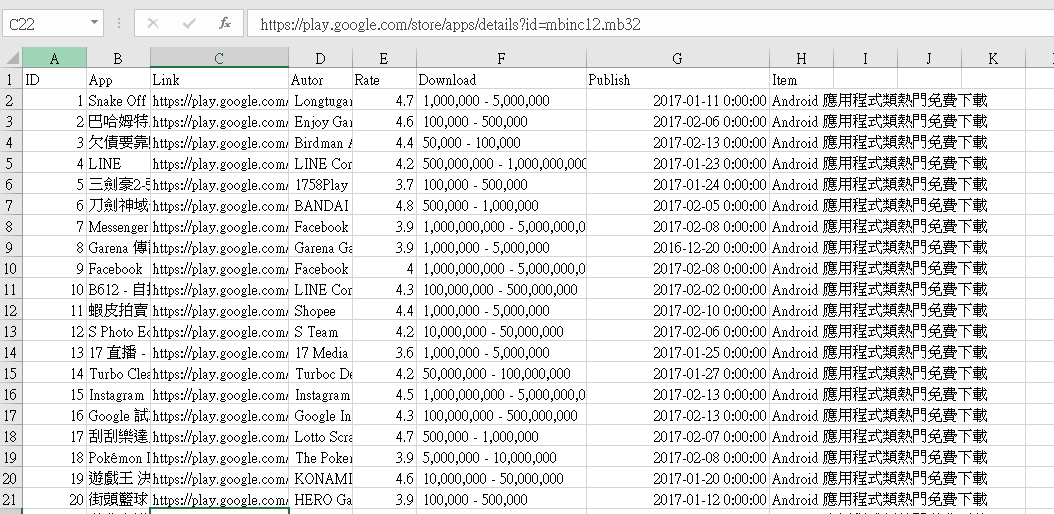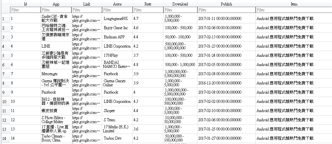 抓取 Google Play Store 資料 (熱門排行榜) 前100筆資料。