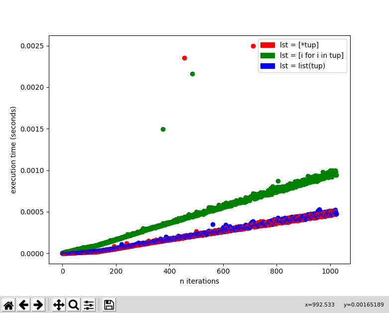 Unsurprisingly, [i for i in tup] was the slowest way as it created a redundant variable i, and the two other methods seem to carry on with the same gradient.