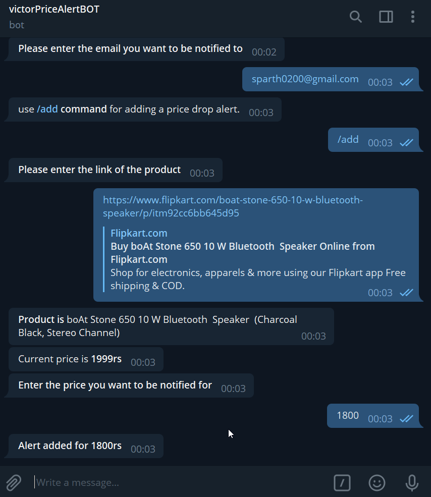 A telegram bot which alerts you if your registered product meets any set threshold price drop. it sends you email as well as msg on telegram.