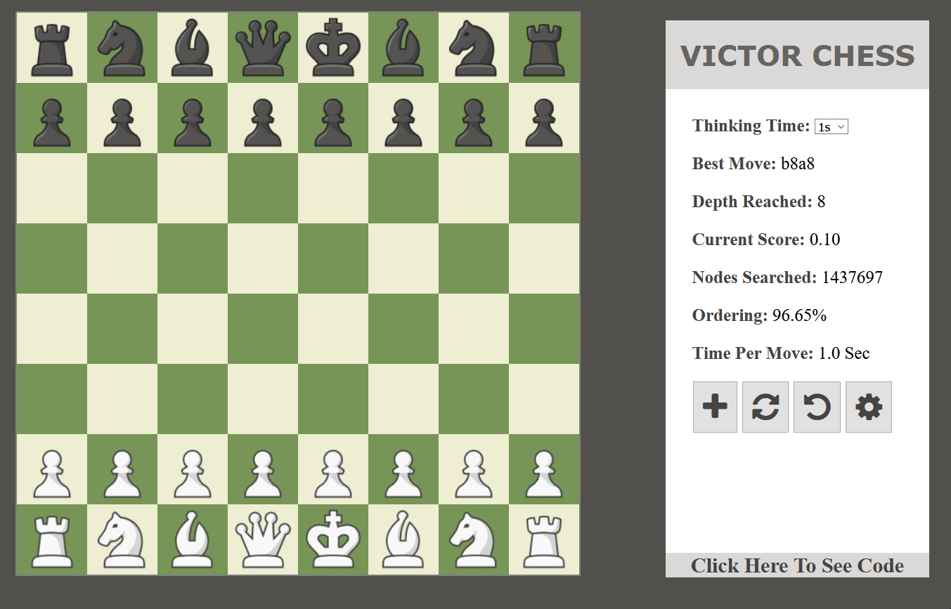 This chess engine with GUI is done with vanilla javascript, engine is based on vice chess engine that is creation of bluefever software, This AI model is itself programmed in plain javascript, and works on Alpha Beta Pruning search algorithm model with transposition table, null move pruning and quiescence inside an iterative deepening framework. Board and pieces are scrapped from chess.com