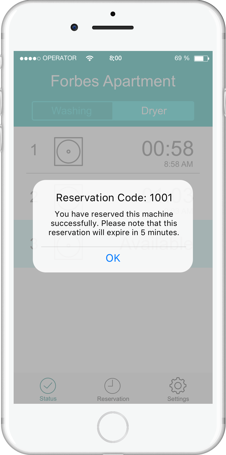 - The quick reservation will last for 5 minutes, so that you have time to bring down your laundry to the laundry room.