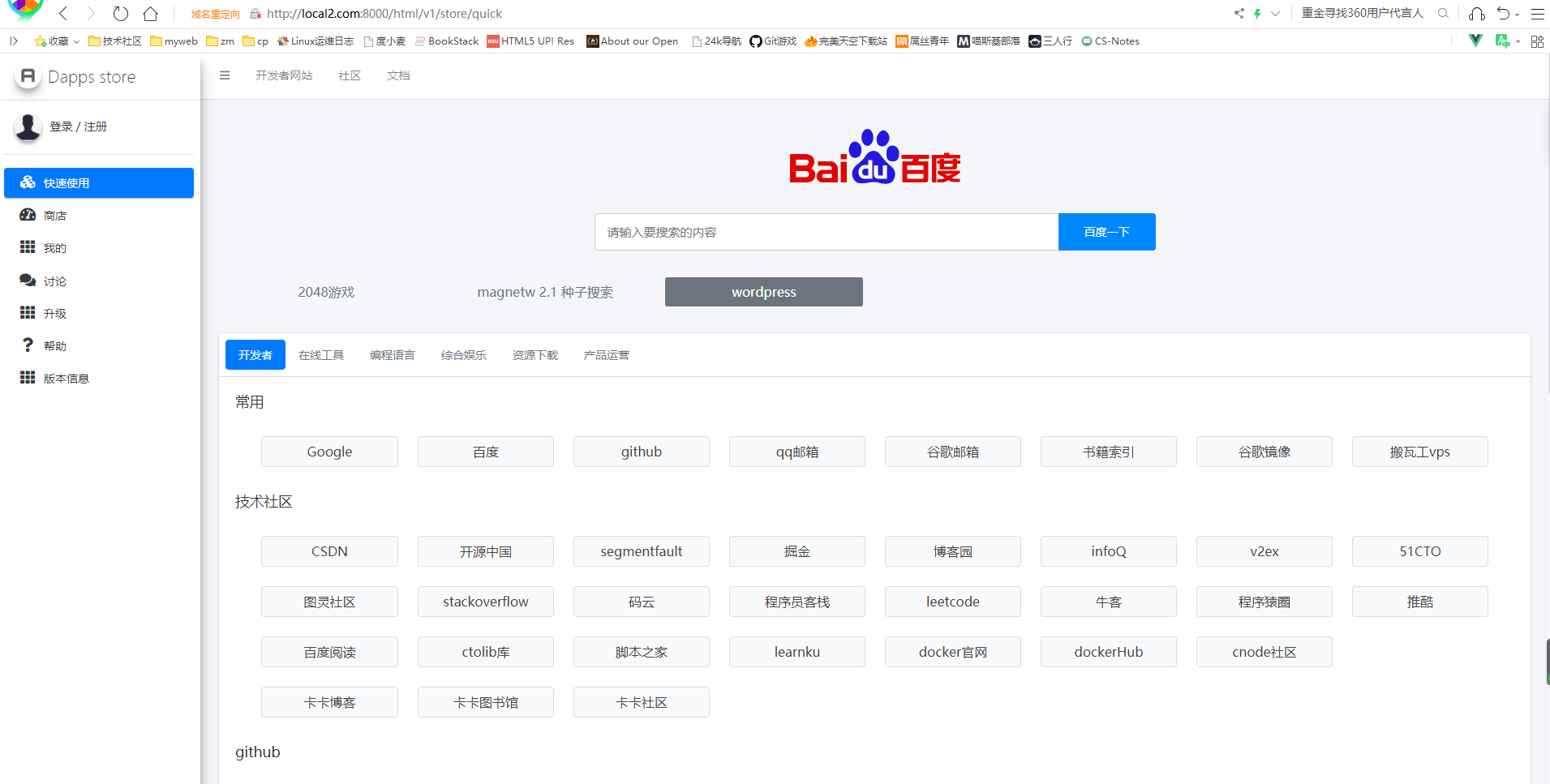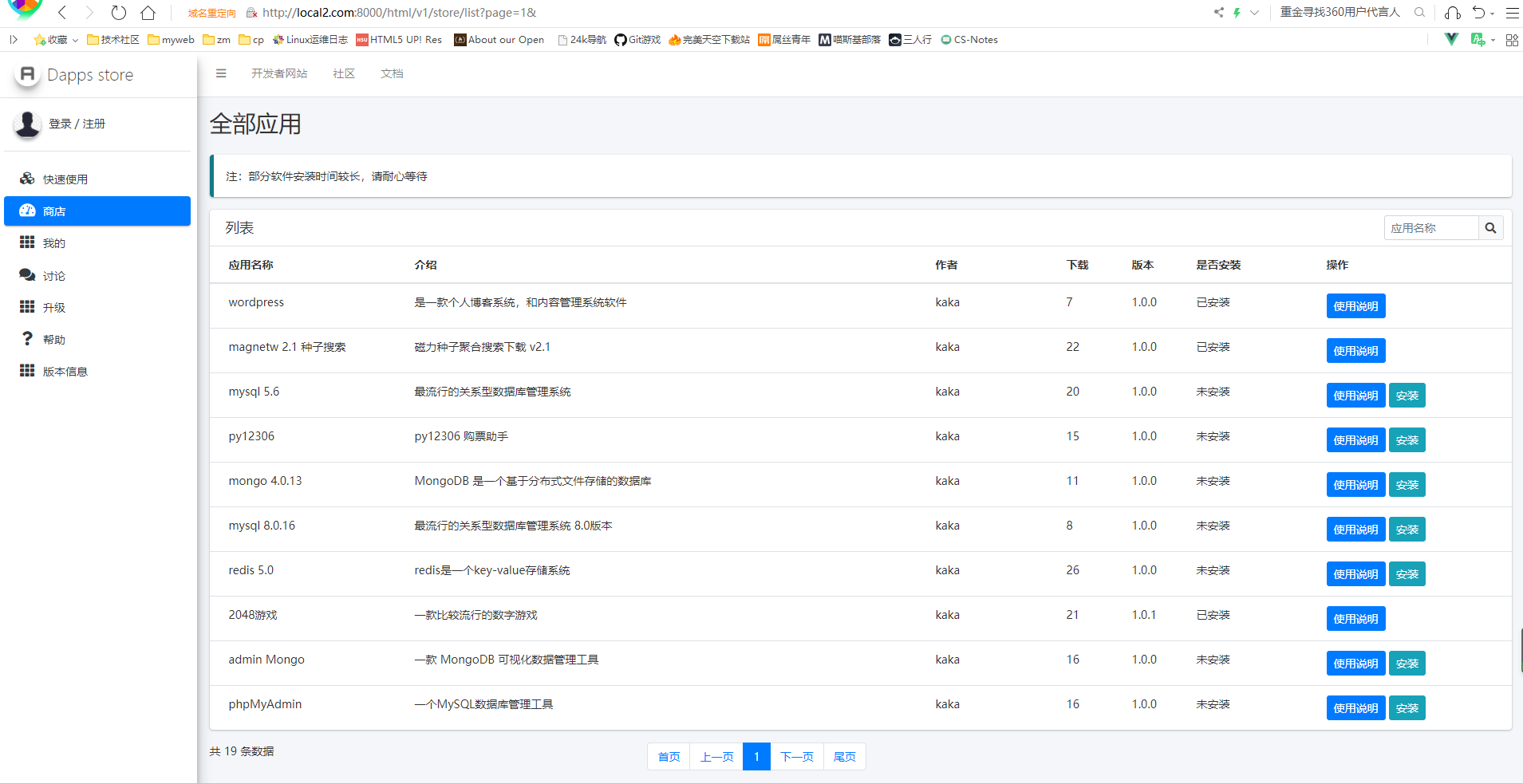 它是一个应用程序商店,包含丰富的软件,因为基于docker,使你本机电脑有云开发的效果。 一键安装程序;多版本共存,完善的使用说明,且不影响本机环境。 前端、服务端、运维、站长可以直接使用,效率提高非常多。普通用户亦可使用其中部分软件。