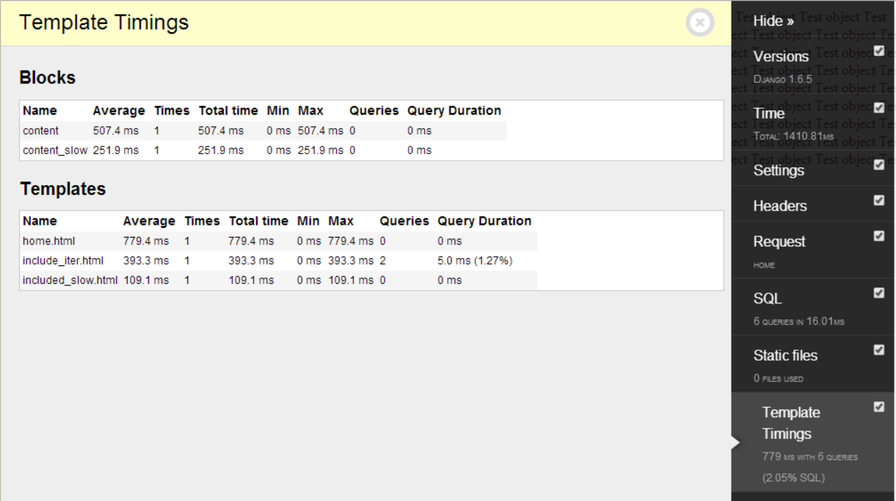 Template-timings is a panel for Django Debug Toolbar that gives an in-dept breakdown of the time it takes to render your Django templates (including templates included via {% extends %} and {% include %}).