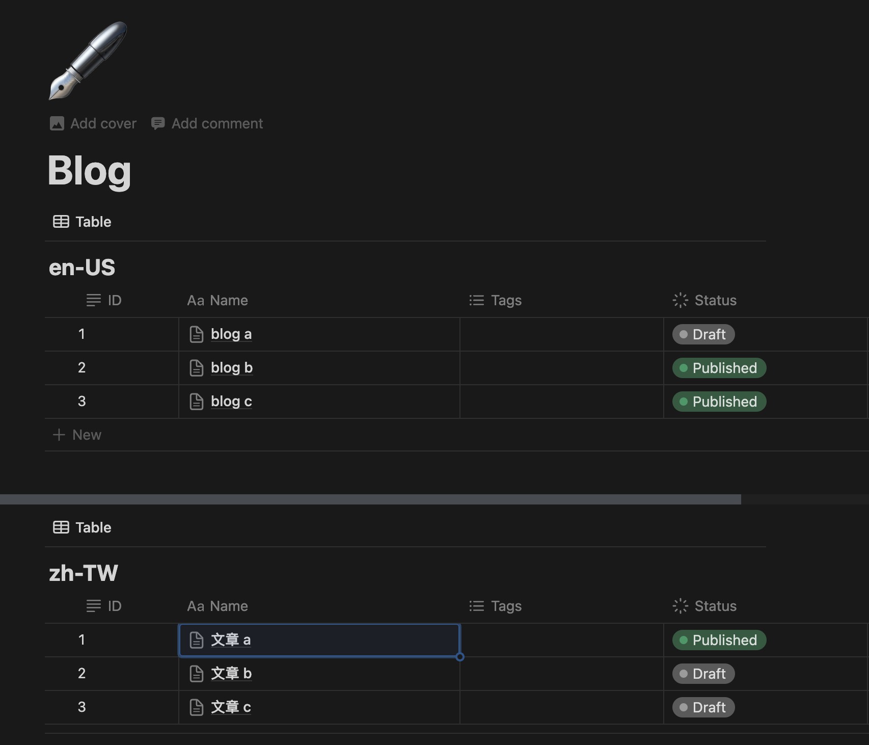.env.localNOTION_DATABASE_ID is the entry point of notion database. This is a page with two inline databases with two locales.- When upload files, the url will expire in one hour. You can see the link for further information.