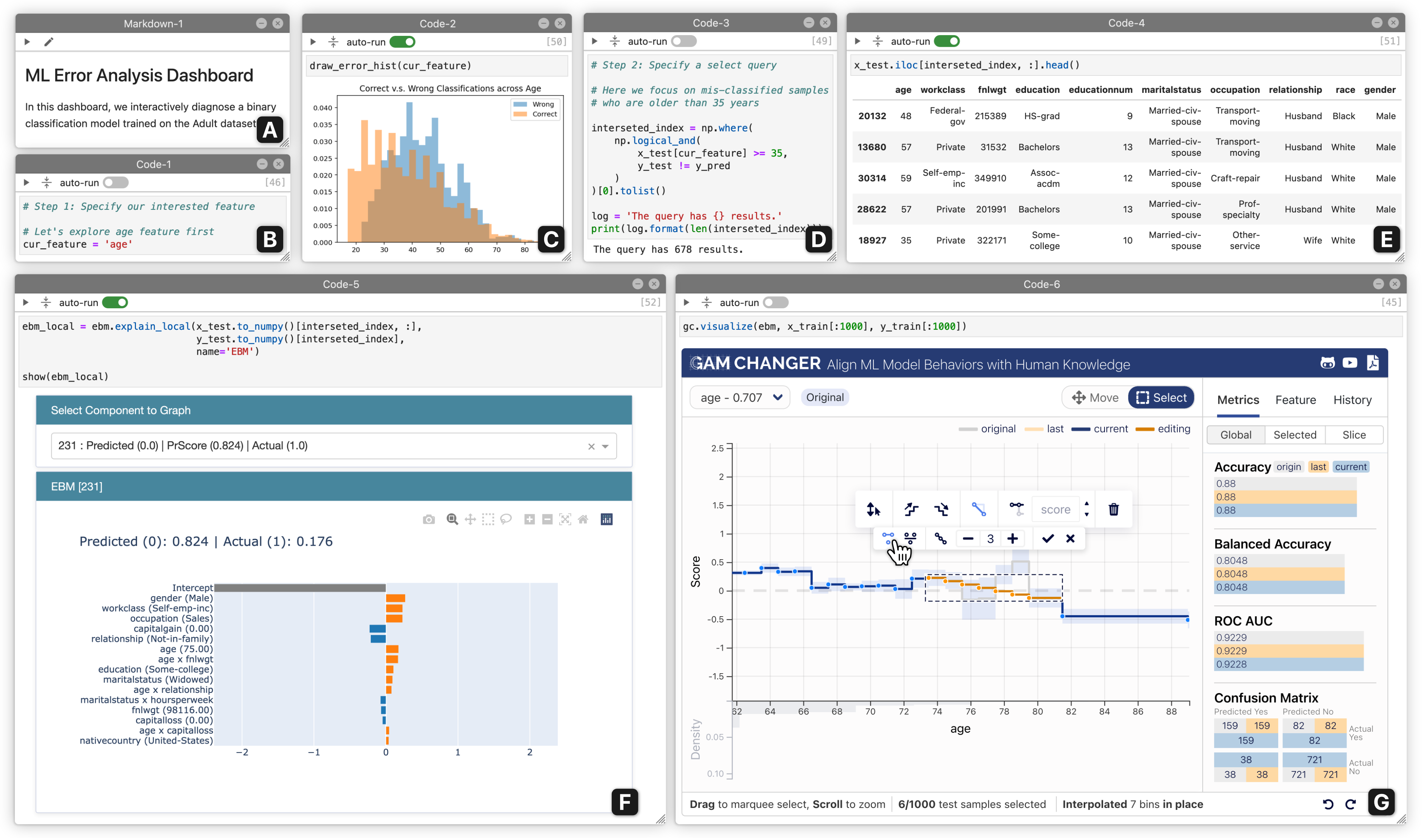 | The ML Error Analysis Dashboard consists of: (A) markdown text describing the dashboard, (B) input field to specify a feature to diagnose, (C) auto-run chart showing the distribution of the specified feature, (D) second input field to further specify the range within the feature to diagnose, (E) auto-run table displaying all samples that meet the criteria, (F) auto-run visualization explaining how the ML model makes decision on these samples, (G) interactive tool allowing the ML engineer to fix the ML model by editing its parameters based on their error analysis. |