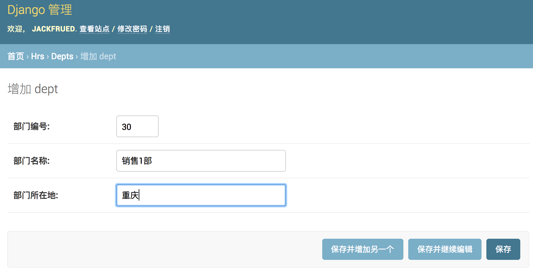 (venv)$ python manage.py createsuperuser Username (leave blank to use 'hao'): jackfrued Email address: jackfrued@126.com Password: Password (again): Superuser created successfully. -
