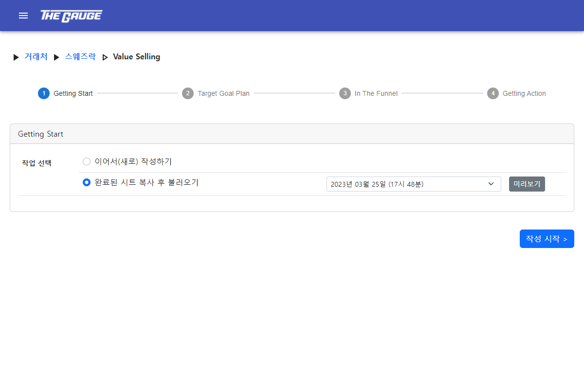 - 중간 저장한 시트를 이어서 작성하거나, 이어서 작성할게 없으면(완료되었으면) 새로 작성할 수 있습니다.