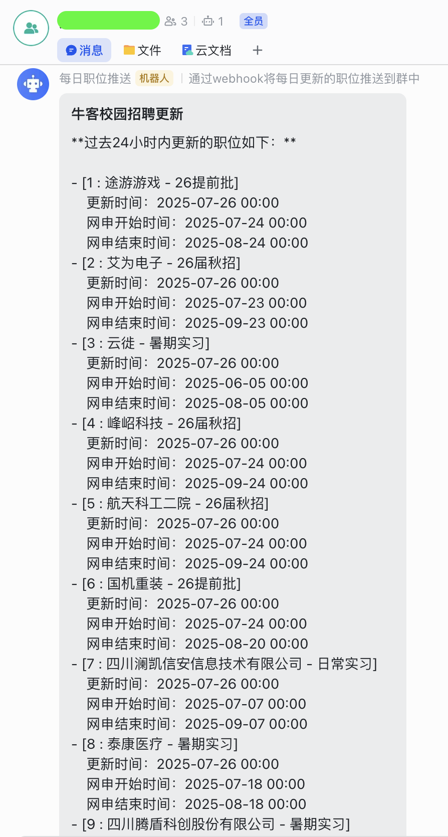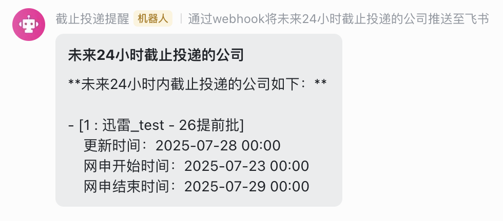 项目应用场景为每天在飞书群中关注24h内更新的校招职位,辅助及时关注新开放的校招职位,提高投递效率。同时,在飞书群中推送未来24h内截止投递的公司,提醒及时投递。